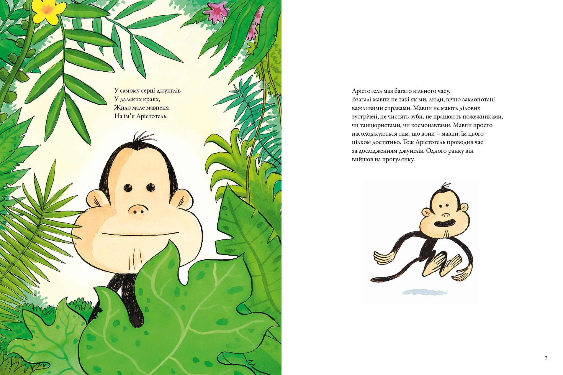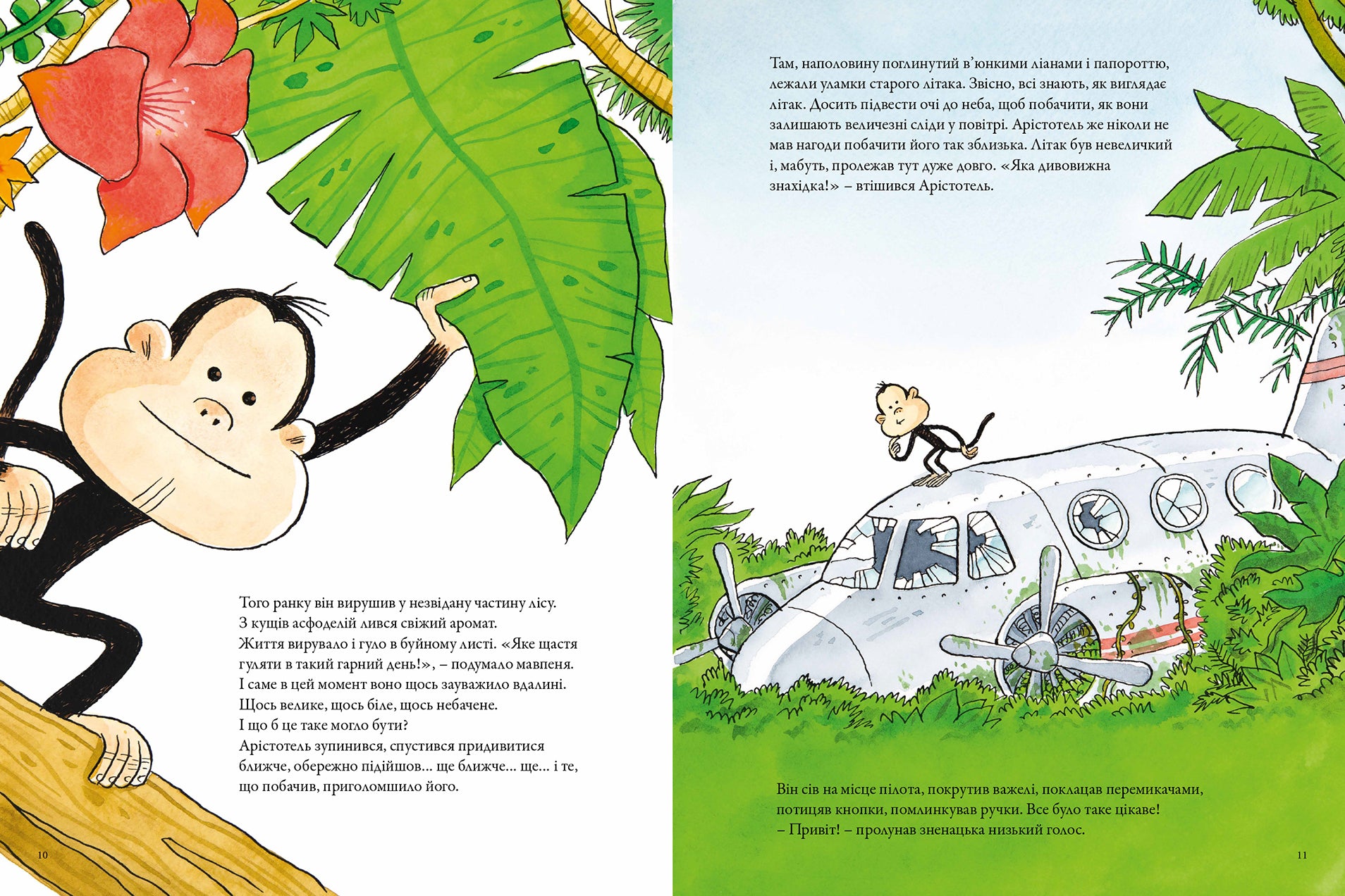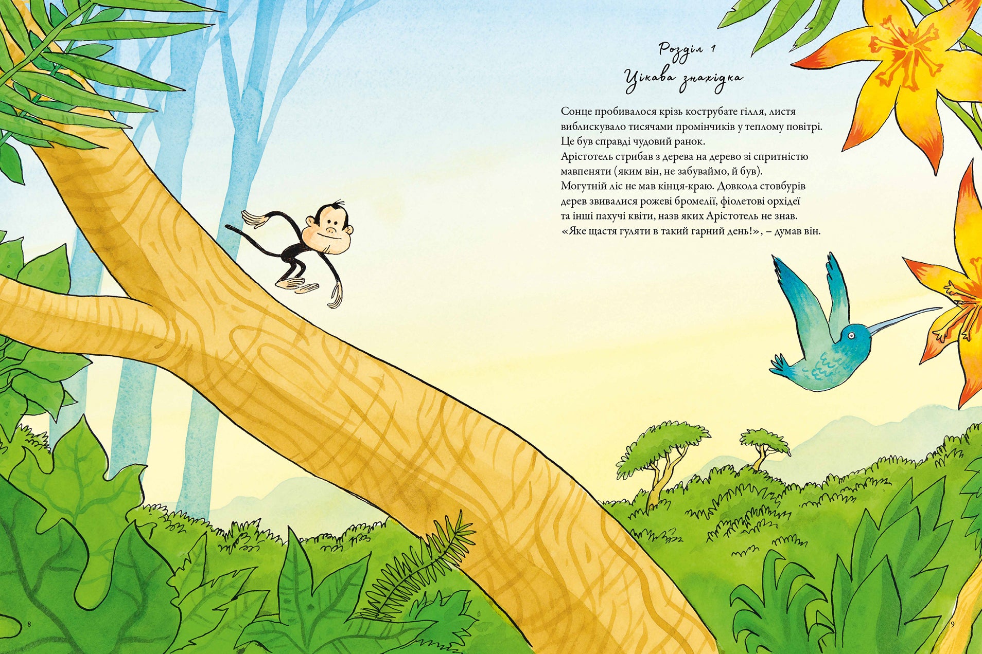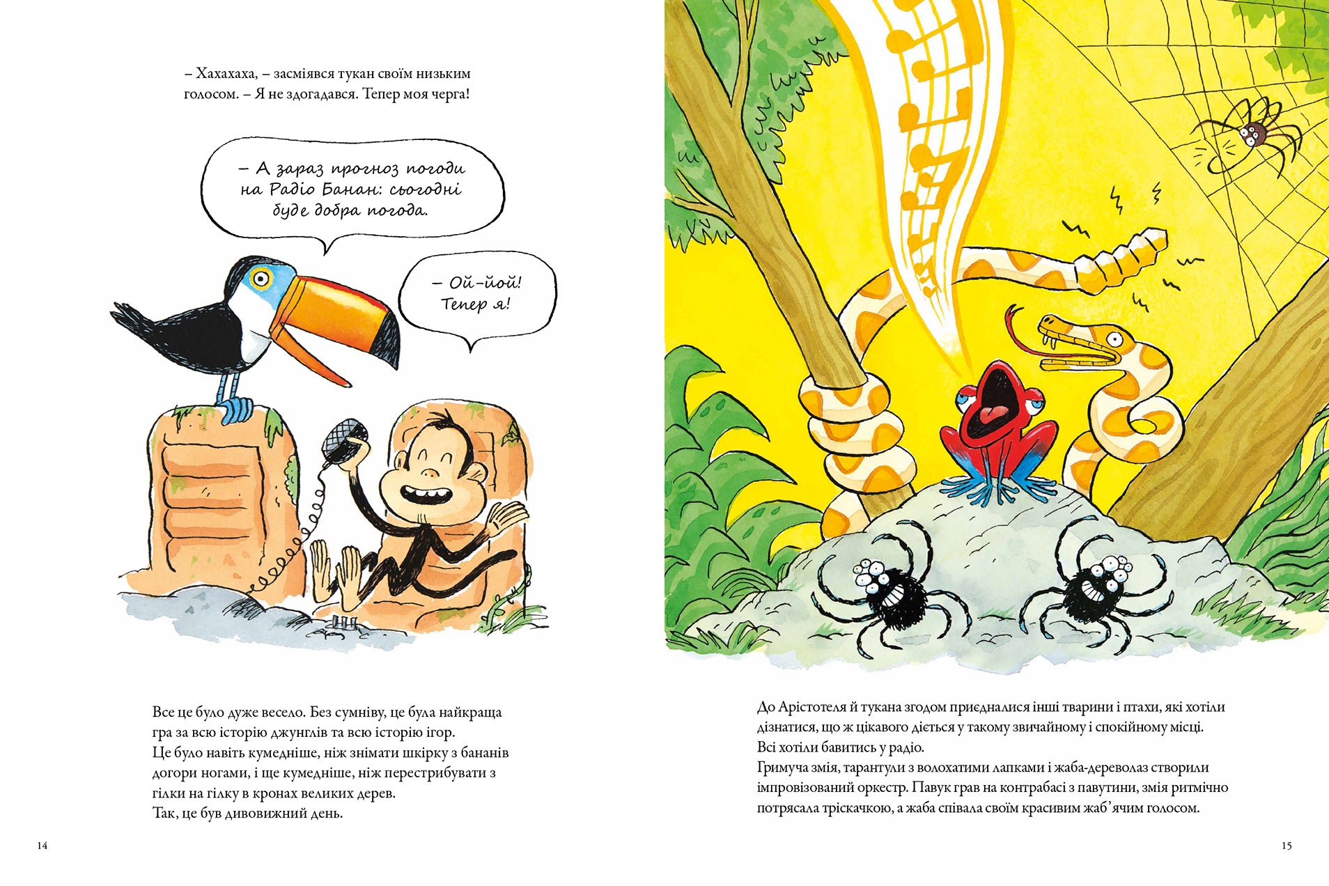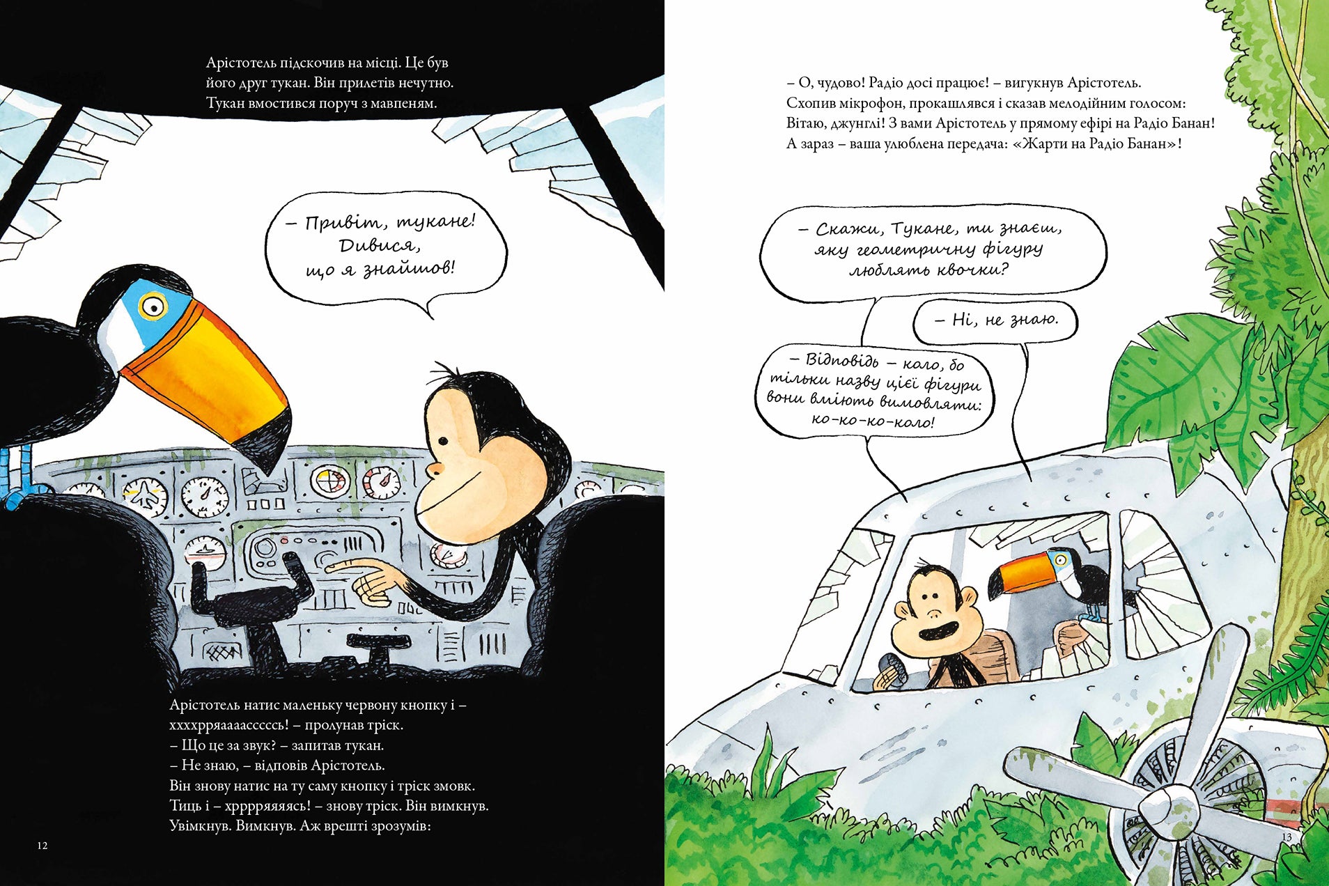 Любий читачу, перед тобою неймовірна історія про «Радіо Банан». У самому серці джунглів маленьке мавпеня Арістотель зробить дивовижне відкриття. Воно стане початком курйозних, яскравих, веселих і дивовижних подій. Ця історія змінить багато життів. Але не будемо забігати наперед – почнімо з початку: одного ранку Арістотель пішов на прогулянку. Ця розповідь складається з семи розділів – на кожен вечір тижня.